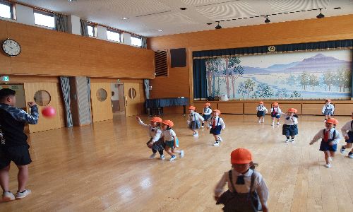本日(21日)、今年度初めての朝会が行われました。 整列の仕方を全園児で行い、その後サンサン体操で体を動かしました。
