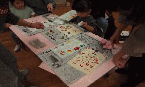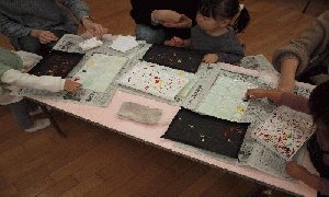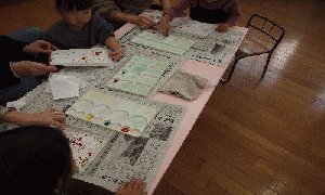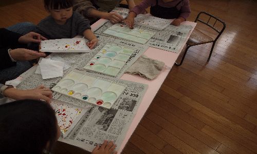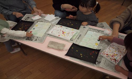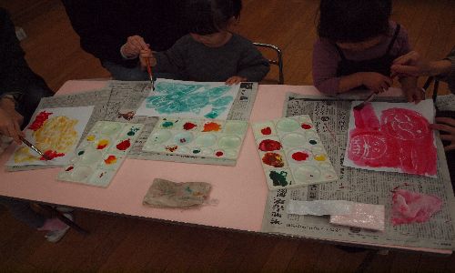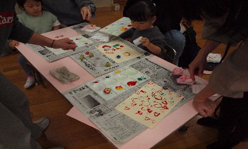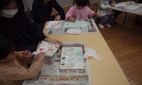 今回の絵の具遊びは、ビー玉絵やスタンピング、はじき絵1時間近く机に向かいお母さんと一緒にいろいろな画法を行い、2~3歳でも楽しく過ごせました。