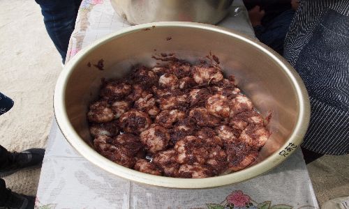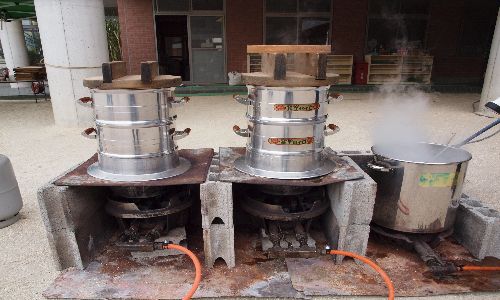 後援会正副会長さんや先生たちが食べやすいサイズに分けてあんこやきな粉を絡めたら完成!