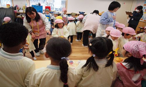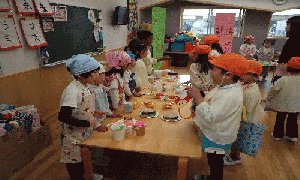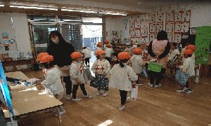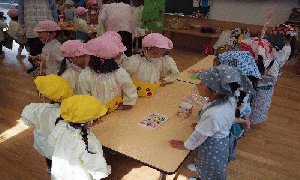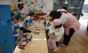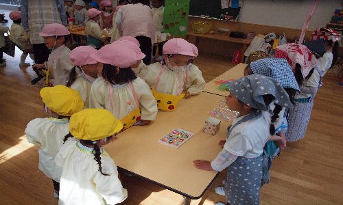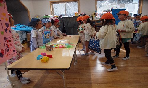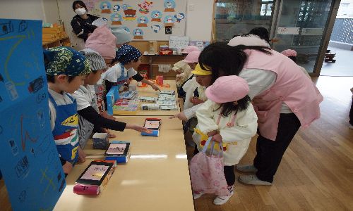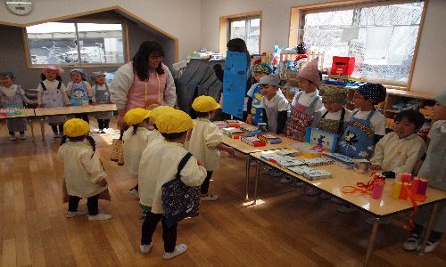 年長児による全部手作り品(アクセサリー・スマホ・おもちゃ・飲食等)を年中少満3歳児が各自欲しいものを選び、手作りの財布からお金を出して買い物を楽しみました。