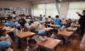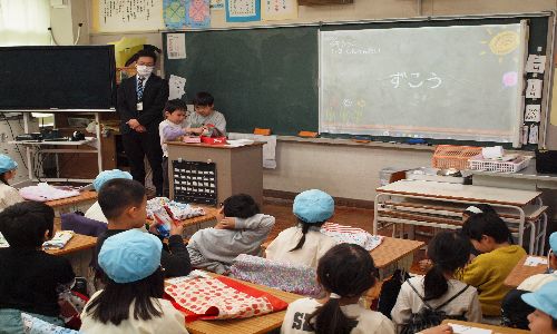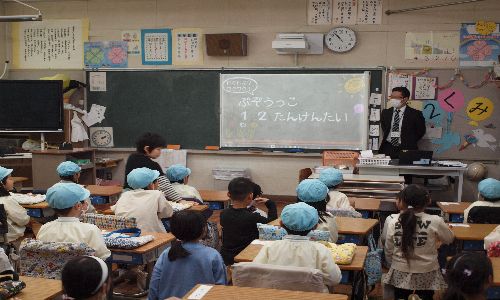 今回は一日の生活の流れと、授業でどんなことをしているのか小学生たちに教えてもらい、授業や給食準備などを体験しました。