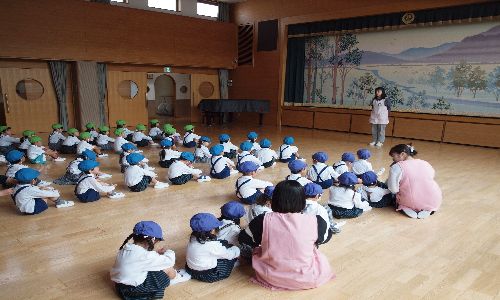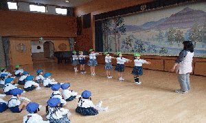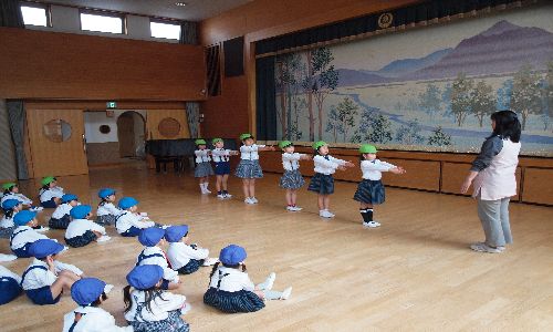整列の仕方を年長もも組がお手本を見せて全園児で行いました。